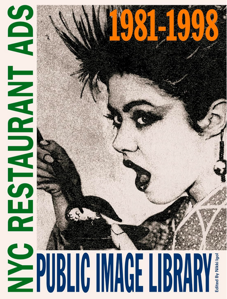 NYC Restaurant Ads, 1983-1998 is the first archival project by Nikki Igol's Public Image Library, published in collaboration with Blurring Books. Drawn from the Public Image Library's print archive, the book documents the evolution of the Manhattan dining scene, as presented in the advertising section of magazines such as Interview, Paper, and Details. This visual archive captures both the evolution of culinary discovery and graphic design as the finicky New York diner, always in search of the "it" spot, discovers the cuisines of the world and the neighborhoods of Manhattan. Restaurants are an ephemeral expression of culture; these advertisements document the ever-evolving New York taste.
